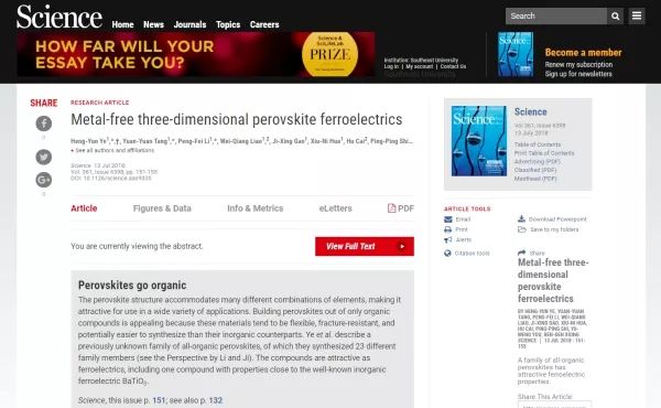 今后,这类材料将在数据存储、逻辑运算、光量子通信、光学雷达、能源转换等应用中崭露头角。这一研究成果被《科学》发表,不但将十余年前的预言变成了现实,为钙钛矿这一重要的材料家族增添了新的成员,同时也为铁电材料的研究带来了新的思路和方向,更是标志着我国在分子材料领域又一次走在了世界前列。