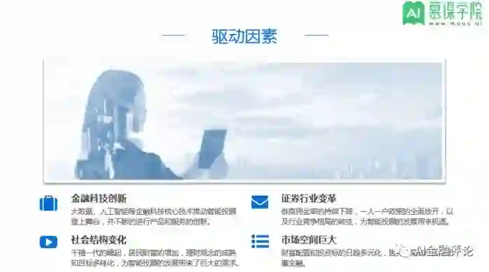 驱动因素一:金融科技创新。大数据、人工智能等金融科技核心技术推动智能投顾登上舞台,并不断的进行产品和服务的创新。