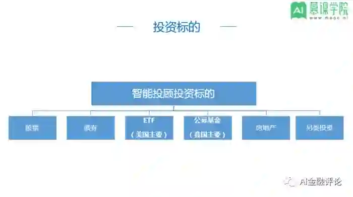 智能投顾给用户呈现的是一个投资组合,投资标的为市场常见的投资品种。背后其实是全球范围内的股票、债券、基金、ETF以及房产、另类投资等投资标的。美国典型智能投顾平台投资标的大部分为ETF,目前国内的ETF产品太少,智能投顾也处于起步萌芽状态。国内当前阶段也只是根据用户自行选择的风险等级和投资期限,给出由多个公募基金构成的投资组合,与FOF比较相似。