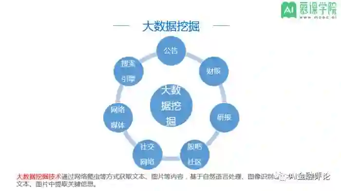 通过网络爬虫等方式获取文本、图片等内容,基于自然语言处理、图像识别等技术,从网络文本、图片中提取关键信息。例如,从公告中提取公司财务数据,从研报中获取一致预期数据,构建网络舆情系统监测行业和概念热点。公司公告(股东大会、重大利好、增发、交易提示、配股、股权股本、重大事项)和财务报表(年报中报季报、业绩预告、业绩快报)、分析师的研究报告、股吧雪球论坛帖子、微博微信社交网络、新闻媒体报道、搜索引擎返回信息呈现给大家的大都是一些非结构化的信息,采用文本挖掘的方法对这些非结构化数据中的金融信息进行挖掘,从而可以在智能投顾中为客户精准推送产品和资讯,辅助客户的投资决策。