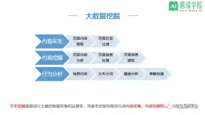 文本挖掘是通过分析互联网,从大量文本数据中寻找其规律的技术。互联网数据具有数据量大、数据结构复杂、数据内容分散等特点,呈现出爆炸性增长的趋势。为了从中提取出有效信息,必须选择合适的数据挖掘策略。文本挖掘需要进行大量的数据采集和运算等,其基本挖掘流程划分成内容采集、内容挖掘和行为分析三个环节。