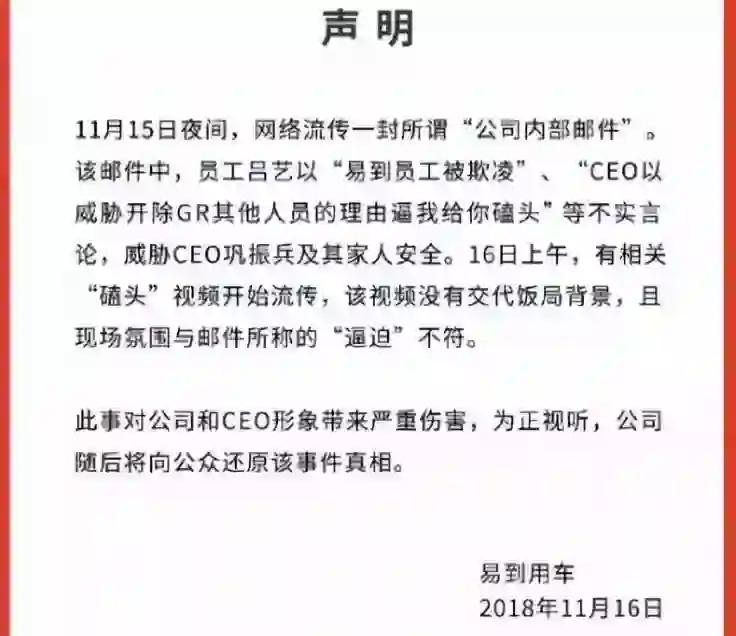 多家媒体报道易到用车高管反应“被逼磕头、遭受CEO欺凌”的相关文章。易到用车回应称这是一场险恶有预谋的饭局。易到方面表示,针对吕艺邮件造谣、诽谤、恐吓巩振兵先生一事,目前,巩振兵先生已向警方报案,公司将适时公布警方处理进展。