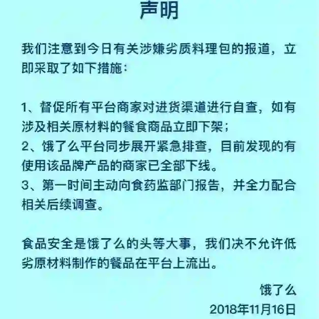 饿了么当日在官方微博发布声明称,在看到有关涉嫌劣质料理包的报道后,饿了么督促所有平台商家对进货渠道进行自查,如有涉及相关原材料的餐食商品立即下架,另外,饿了么平台同步展开紧急排查,目前发现的有使用该品牌产品的商家已全部下线。