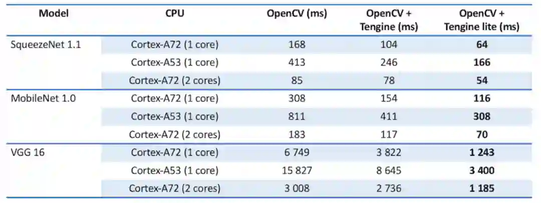 OpenCV的合作伙伴OpenAI Lab通过使用其新的“ Tengine lite”(更轻量的C语言中Tengine的重新实现),进一步提高了OpenCV DNN在ARM上的性能。这是比较性能表(batch_size = 1,已在EAIDK-610上进行了测试):