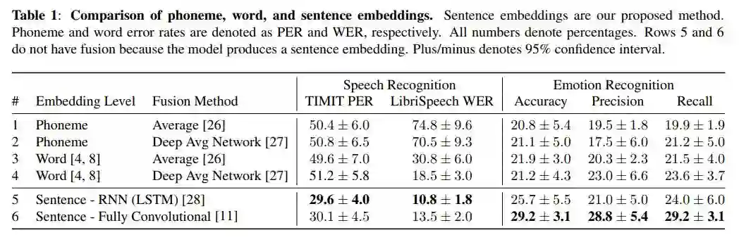 句子级嵌入在这两个任务上表现均优于音素和单词嵌入。这对于 RNN 和我们的完全卷积 TCN 模型都是如此。与我们方法学习的嵌入相比,音素级嵌入在语音识别方面表现不佳(WER 超过 70%)。与融合方法相比,深度平均网络(DAN)并没有显著超过 uniform average 水平。均匀平均向量(即输入)已经是信息瓶颈。