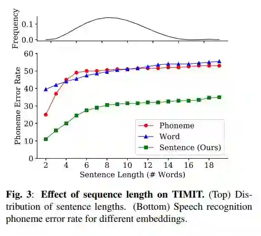 图 3 显示了序列长度对语音识别性能的影响。一般来说,当句子变长时,简单嵌入的性能表现为较低的性能。我们的方法也证实了这种模式,因为较长的句子有更多的内容拟合固定大小的嵌入。这个问题可以通过可变长度嵌入来解决,其长度随着句子的长度线性增长。