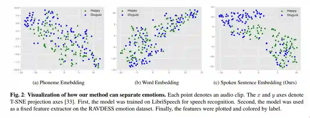 对于这个实验,我们采用了预训练的口语句码编码器,在 LibriSpeech 上训练,并为每个 RAVDESS 音频片段提取句子嵌入。然后我们在图 2 中可视化了不同情绪的嵌入。请注意,我们的模型从未见过来自 Ravdes 数据集的训练样本。在没有进行情绪识别训练的情况下,我们的句子嵌入仍然可以聚集情绪。