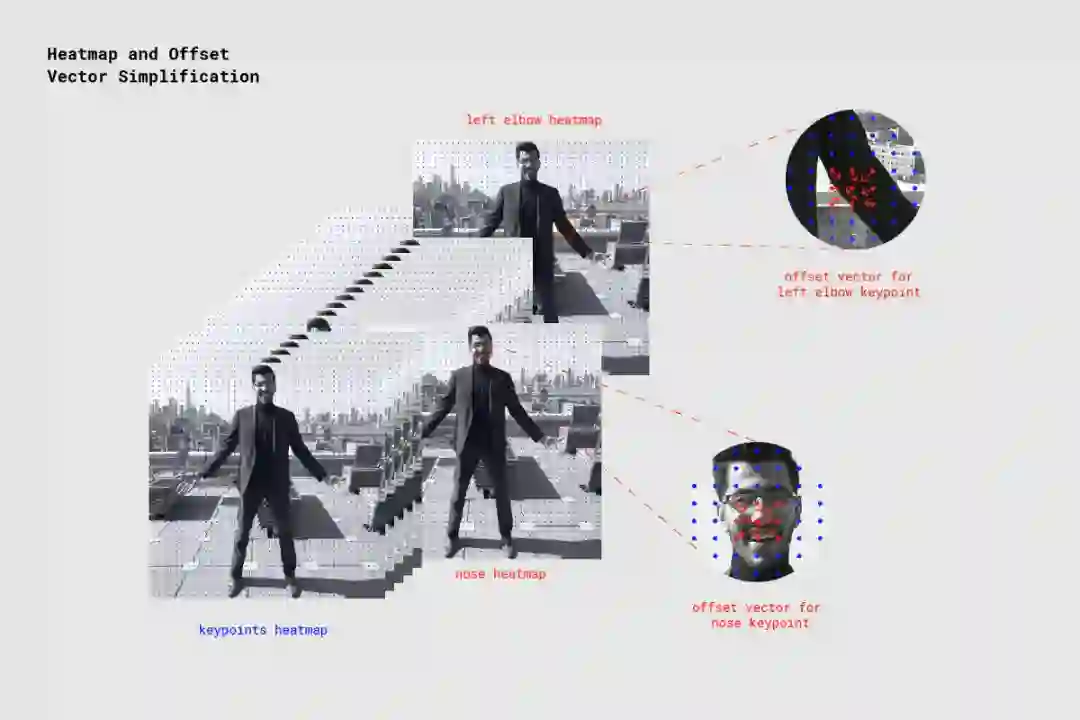 PoseNet 返回的 17 个姿态关键点中每一个都与用于确定关键点确切位置的热图张量和偏移向量张量相关联。