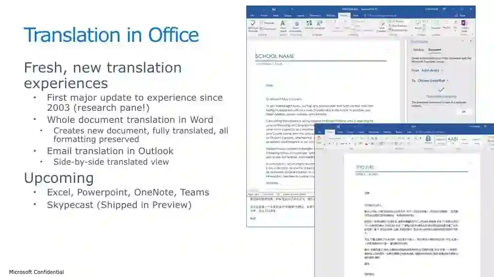 分享一下我个人的经历,我在八十年代离开清华,当时在清华学的都是美式英语,然后到苏格兰爱丁堡大学留学,当时我就懵了,因为苏格兰教授的口音非常严重,当时我就想要是有一个字幕机多好?那是三十年前的痛点,今天可以很骄傲地告诉大家,这个痛点早就可以由微软Office免费为大家提供同声翻译服务。大家可以让教授在台上讲苏格兰英语,台下可以在你的手机上看到从希腊文到广东话的近60种语言的实时字幕翻译。这是非常振奋人心的时刻,如果今天还有哪位同学要去苏格兰留学,我想大家不会再为苏格兰英语而苦恼了。