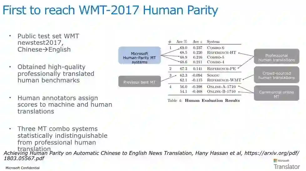 我们还有从左到右、从右到左的联合优化函数,再一次提高了机器翻译的质量,就是因为这些联合系统的组合造就了我们历史性地第一次达到了中翻英超人的水平。要做其它语言同样是没有问题的,我们希望其他语言和中英翻译的落地很快就会产业化,再再过一些时候你们再用Microsoft Translator的时候会享受到与真人相似的机器翻译质量。