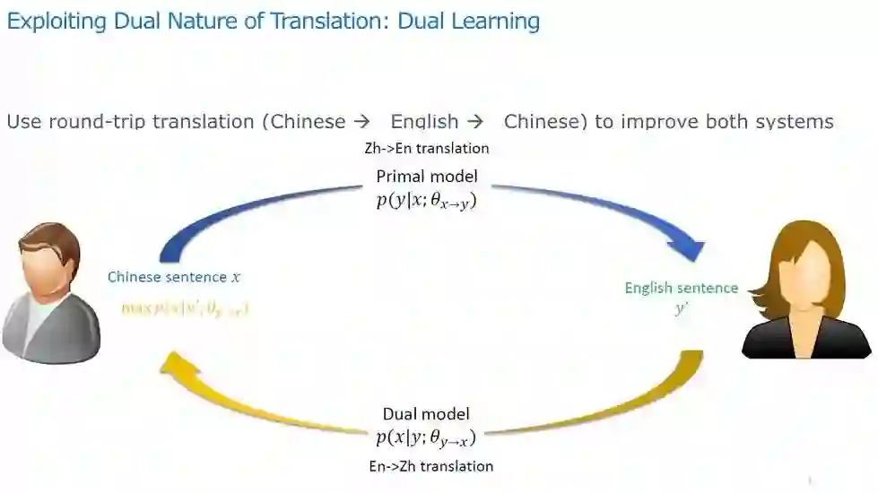 微软亚洲研究院自主研发的Dual Translation Learning,就是大家在中英翻译的时候,翻译成英文后再用一下反向翻译,就是英翻中,保证这两种翻译的一致性比较好,可以得到一个最高、最优的联合优化目标函数。通过这样一个正向和反向的翻译,我们可以大大提高现有机器翻译的质量,这是和人进行翻译的过程类似的机器学习的新算法,机器翻译上取得了长足的进步。