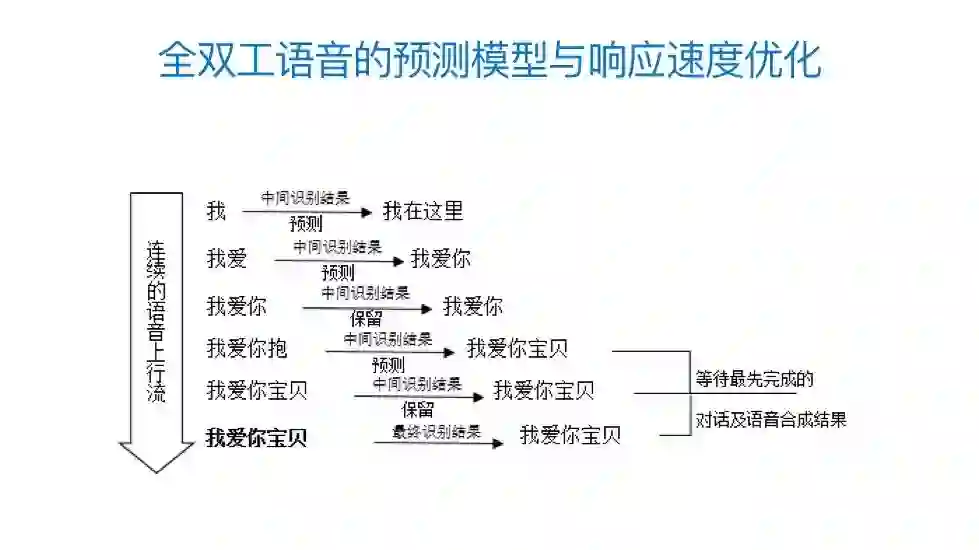 这是微软和哈曼音箱联合推出的联想语音识别系统,唤醒智能音箱的时候不是非常自然,微软最近和小米联合推出了全双工的语音对话系统,就是唤醒以后可以连续讲,不需要每次都说唤醒词“小娜”再说语音指令。这是微软核心的语音技术在中国落地的一个非常好的案例,它的基本思想非常简单,就是我跟你讲话,比如我见到邓院士每次都说“邓院士,今天你好吗?”“邓院士,你今天吃饭了没有?”所以大家会觉得很烦,全双工的系统只要唤醒一次,接下来就可以很自然地跟它交互。