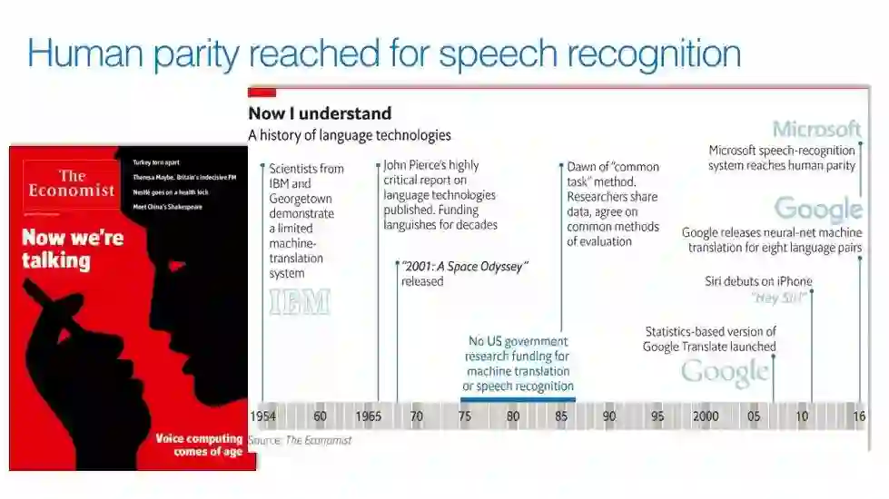 去年《经济学人》有一篇封面文章,总结了过去的四十年语音和语言的重要进展,早在五十年代IBM就开始了机器翻译的工作,那个时候我还没有出生。过去的几年当中有三个很重大的历史事件:苹果第一次推出Siri,也就是手机上的个人助理。Google推出了基于神经翻译的产品,大大推动了机器翻译的进步。微软第一次在业界历史性地创造了超越人的自然对话系统——语音识别系统。
