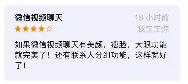 还有,希望视频聊天有美颜、瘦脸、大眼功能……(这位宝宝,你这是想要全网直播吗?!)