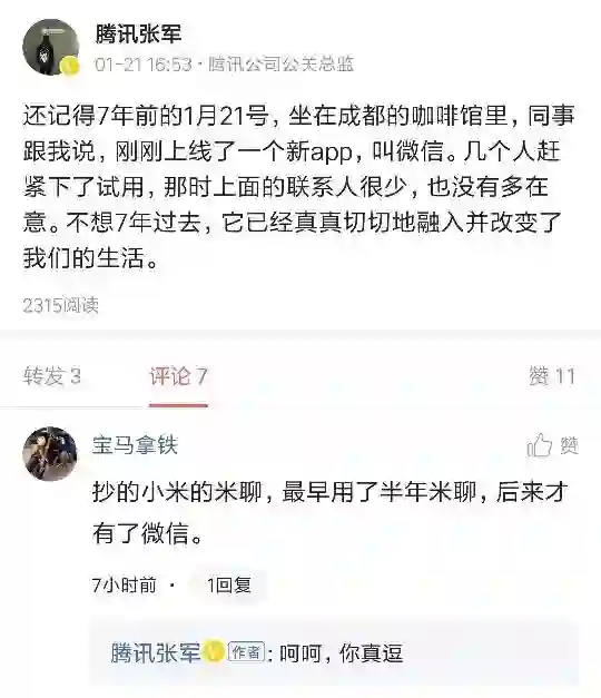 2010年12月,比微信面世的时间更早,米聊发布安卓版本。特别是两款产品存在诸多相似的地方,即便是七年后的2018年初,还有人不依不饶,在腾讯公关负责人张军感慨微信走过7年的微博下呛声:抄的小米的米聊……