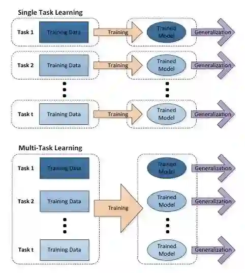 下图展示的是单任务学习和多任务学习的流程图,可以对比一下区别。