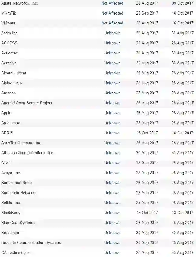 这里有一张美国cert 发布的受影响厂商列表(文中只列举了目前确定受影响的厂商和确定未受影响影响的厂商,其他厂商目前是否受影响情况未知)
