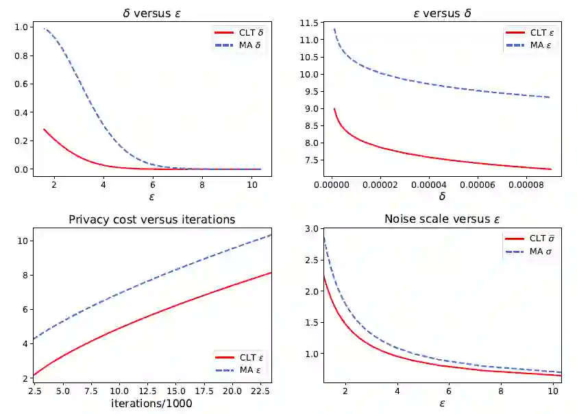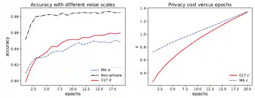 作者构思了一个实验来说明这一点:训练一个加了 sigma 噪音的神经网络若干步,通过 MA 可以算出目前损失了多少隐私,通过 CLT 和 Dual 反解出真正必须的噪音 sigma hat。注意 sigma hat 必然小于 sigma,然后训练同一个神经网络但只加 sigma hat 噪音。由于噪音变小,新的神经网络学习效果会更好,而且在每一次迭代,新神经网络都会更好地保护隐私。