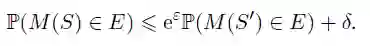 我们说这两个数据集是邻近的,因为它们的差异仅体现在一个人上。我们的目的是检验我们的模型是否是基于 S 训练的,这等价于检验小明是否存在于我们的数据中。如果这个假设检验非常困难,那么想要获取小明信息的攻击者就难以得逞。严谨来说,一个随机算法 M 符合 (epsilon,delta)-DP 意味着对于任何的事件 E,