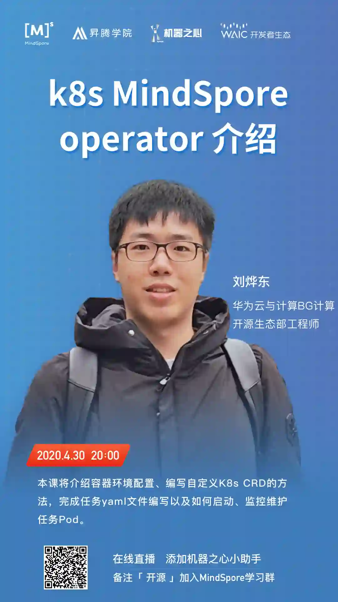 4 月 30 日,机器之心联合华为昇腾学院开设的线上公开课《轻松上手开源框架 MindSpore》第四课将正式开讲,主题为「k8s MindSpore Operator 介绍」,欢迎读者报名学习。