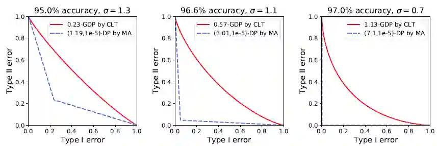 此前谷歌也曾将 epsDP 和深度学习结合,虽然在 MNIST 图像识别上取得了 97% 的正确率(无隐私算法可达到 99% 以上),在 CIFAR10 上却止步于 73% 的正确率(无隐私算法可达 86%)。而利用 GDP 的精确刻画,作者们在 MNIST 上取得了 98% 的准确率。不仅如此,MA 计算的结果表示 MNIST 的 96.6% 正确率对应的是 9.4% 的最小错误和,意味着攻击者有超过九成的概率猜对一张图片是否在数据集中。而 CLT 的计算表明 epsDP 太过于保守:同样的模型同样的表现,实际对应的最小错误和其实是 77.6%,也就是说隐私并没有损失很多。