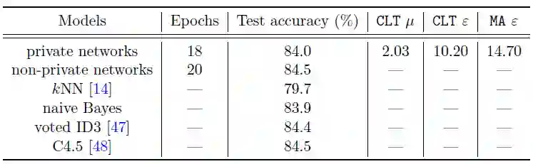 作者实现了 SGD 和 Adam 的隐私版本,并通过让神经网络不断迭代直到 GDP 达到了 mu=2。在 IMDb(自然语言处理),MovieLens 1M(推荐系统)和 Adult Income(非图像型分类任务)上,GDP 模型都取得了非常接近无隐私模型的性能。例如在 Adult Income 数据上,隐私神经网络和无隐私神经网络表现几乎一样好,意味着隐私也许并不需要以很大的性能牺牲为代价。更进一步的,作者强调文中的神经网络都相对简单(不超过三层),如果使用更复杂更高级的神经网络可以在同样的隐私保证下更显著地提升性能。而另一方面,使用高效的优化算法(减少迭代次数,即隐私的损失次数)也能让性能变得更好。