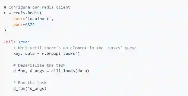 很好。我们的代码使用dill来把要执行的函数序列化为一个任务,然后存储到redis中。
