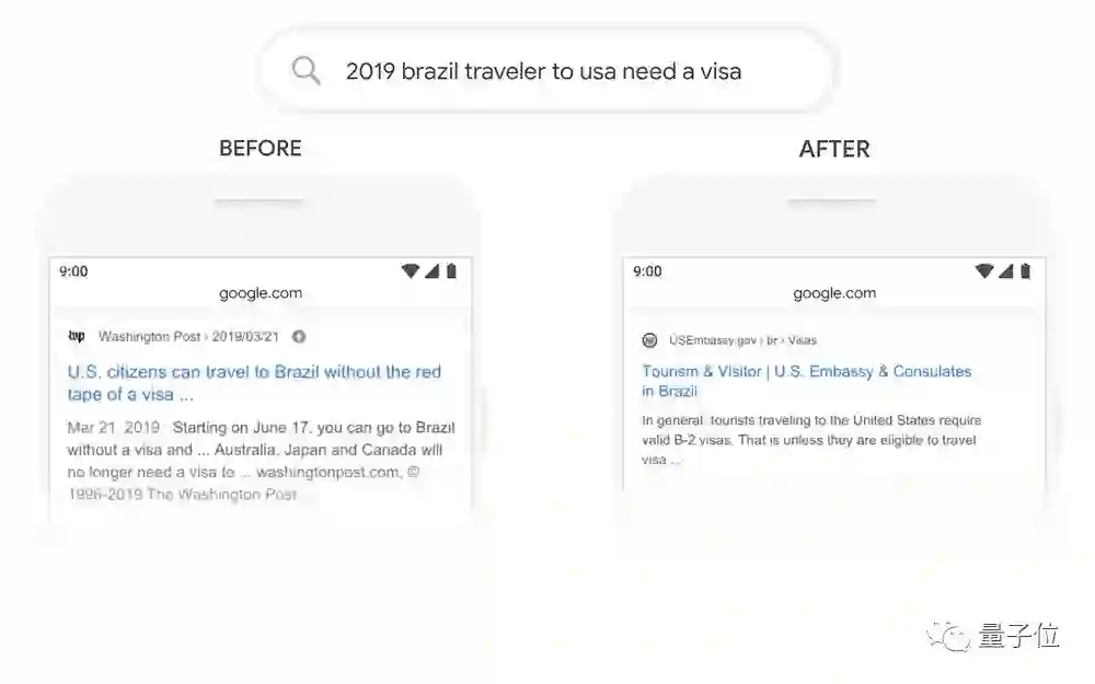 前面提到的查询“2019 brazil traveler to usa need a visa”,过去由于搜索引擎无法理解语义,不知道“前往”(to)在这句话中的重要性,因此返回了错误的结果。