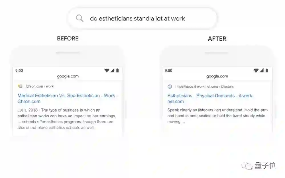 又比如,向搜索引擎提问:“Do estheticians stand a lot at work?” ,过去系统无法理解语句中“stand”的含义。
