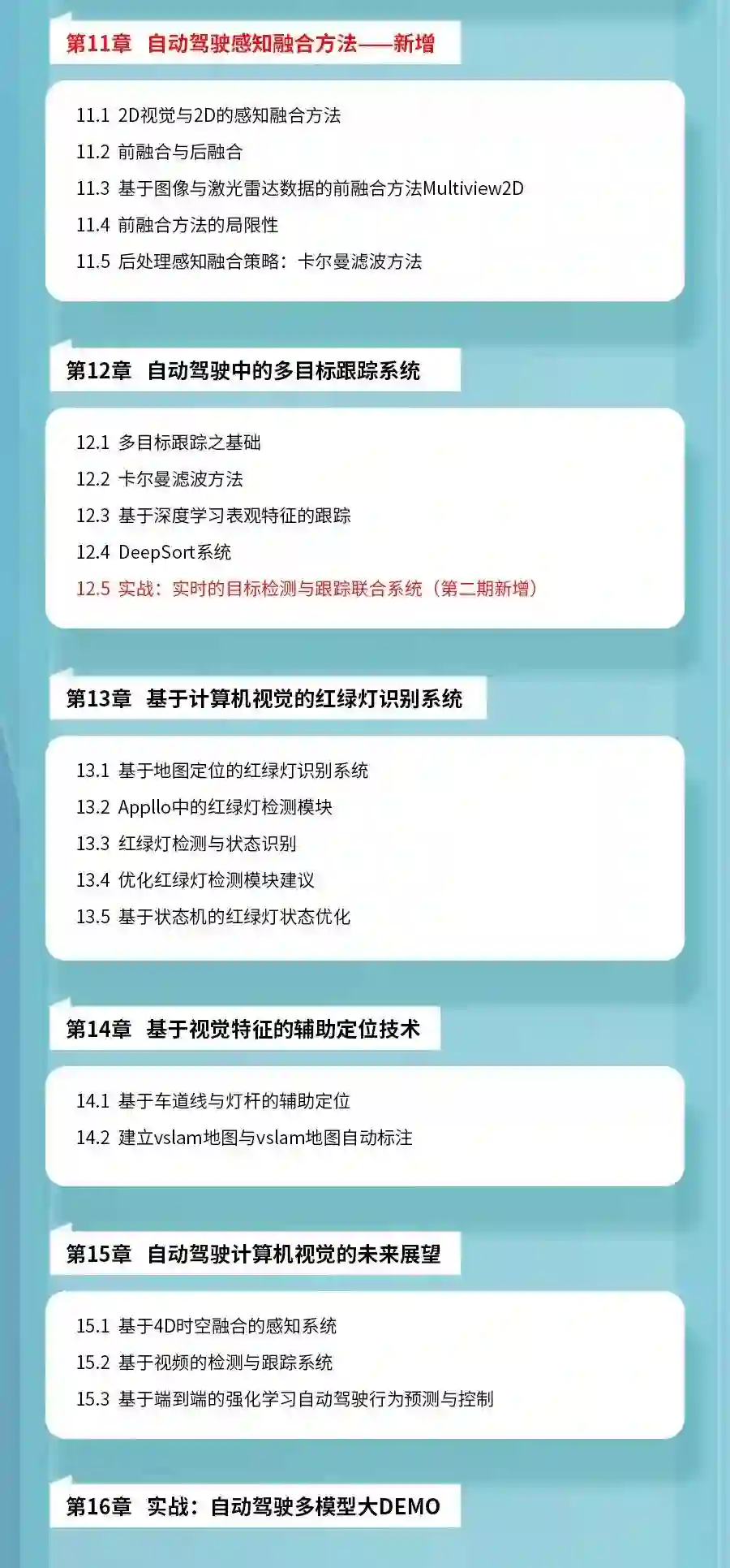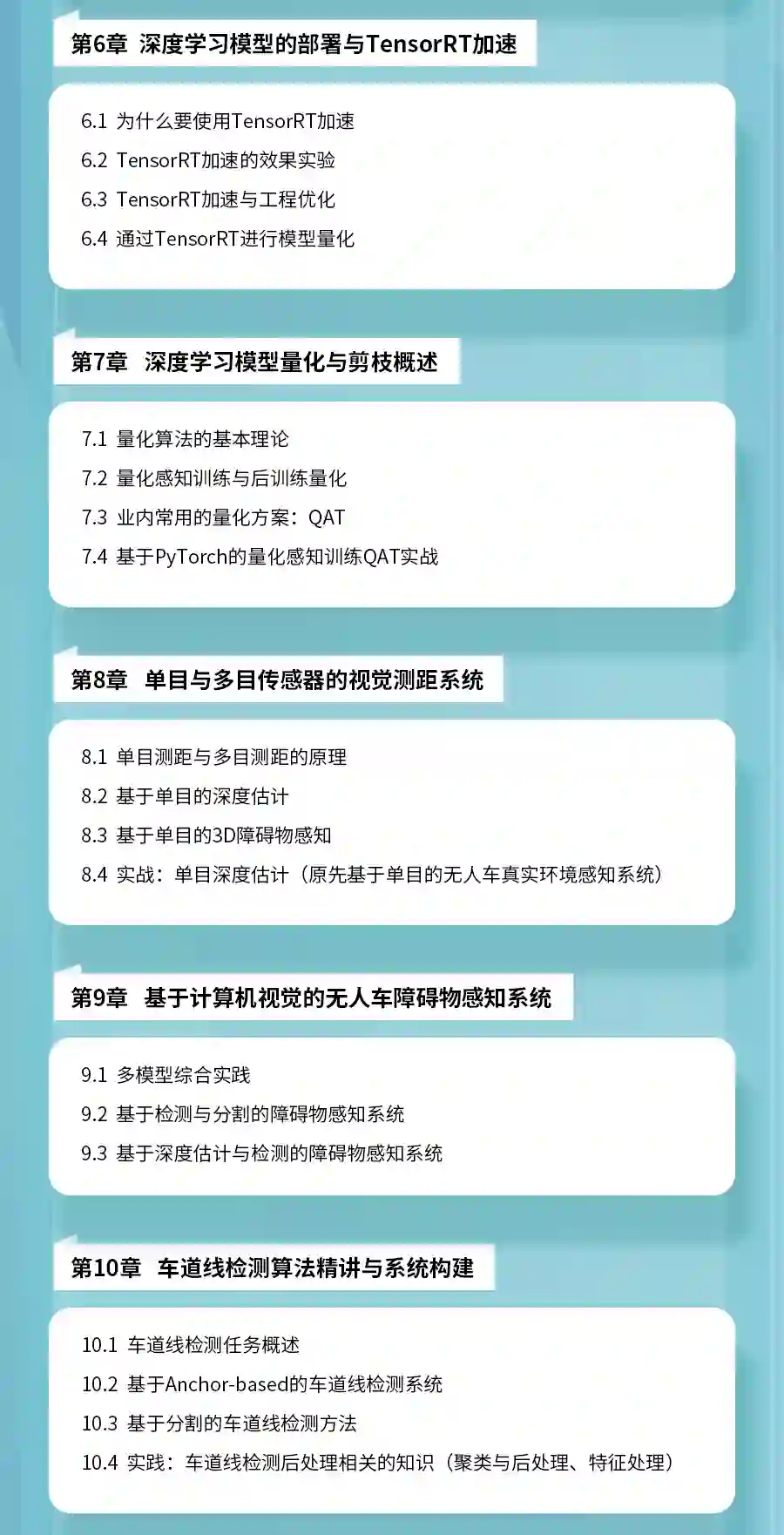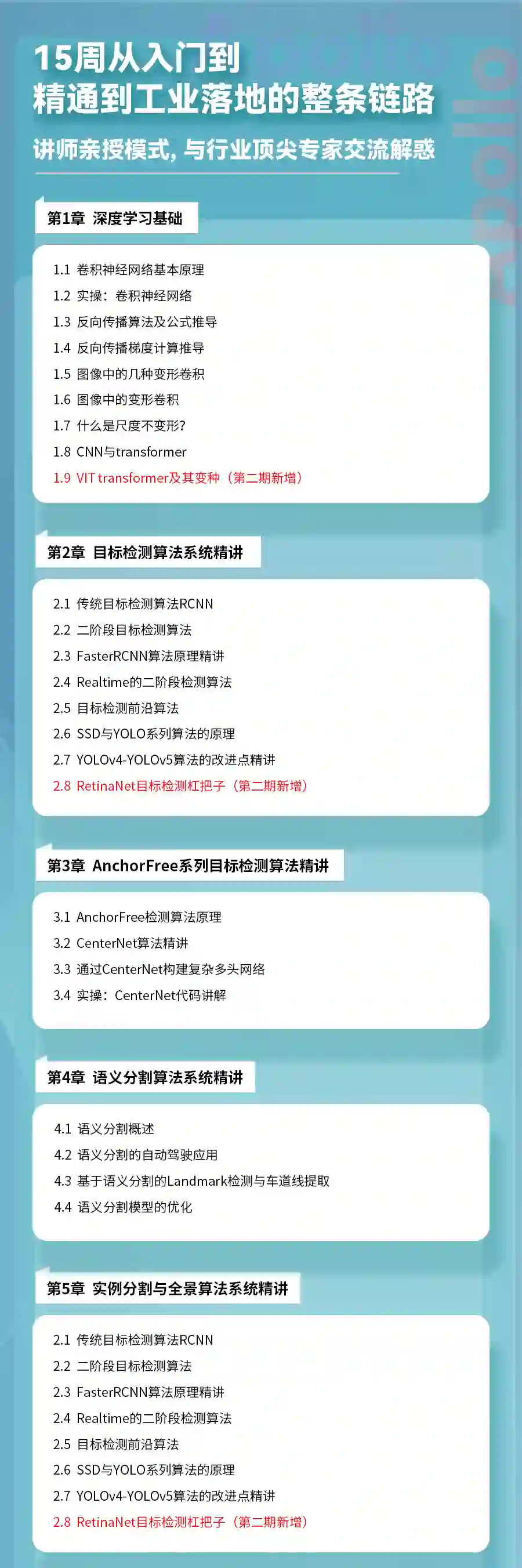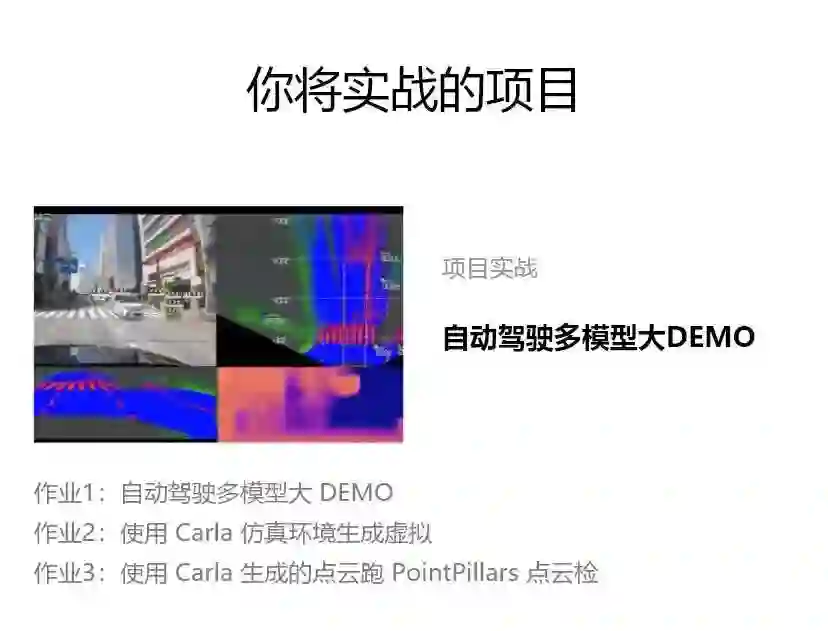 本课程几乎囊括了自动驾驶(AI)算法工程师需要具备的所有技能点,从最基础的神经网络原理到各种目标检测算法,再到最前沿的AI算法落地,剪枝量化与TensorRT并行加速,再到语义分割、实例分割、甚至是全景分割任务,最后落地到自动驾驶感知系统的构建、车道线检测系统、红绿灯识别与控制系统,深入的介绍每一个模块的的问题以及解决方法,深入的介绍每一个模块的的问题以及解决方法,让您无论是在学术领域还是工业领域,对自动驾驶感知系统都有一个高屋建瓴的理解和把握。