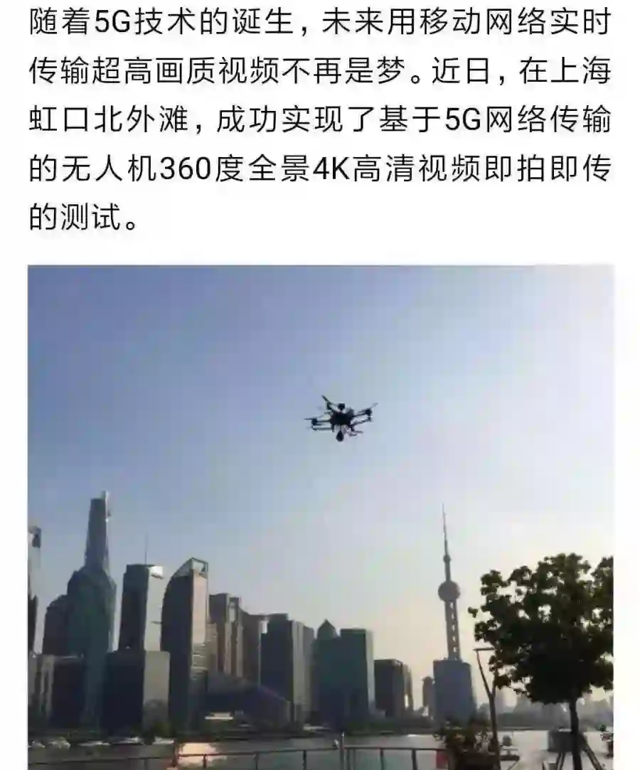 部分无人机高清相机和显示器已经达到4K分辨率及以上,传输画面质量的短板在于无线图传,目前只有5G网络才能支持无线4K视频传输,首次4K高清无线图传于2018年5月在上海外滩试验成功。