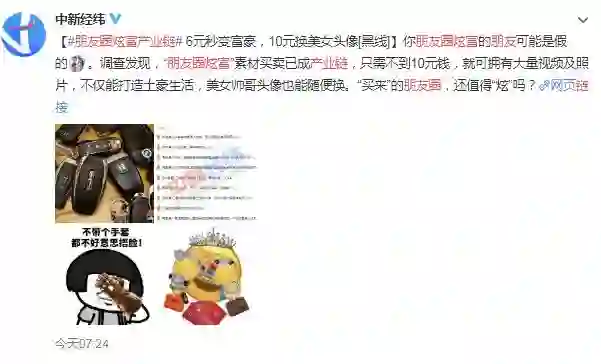 “朋友圈炫富”素材买卖已经形成产业链,只需不到10元钱,就可拥有大量视频及照片,不仅可以打造“土豪”生活,美女帅哥头像也可以随便换。