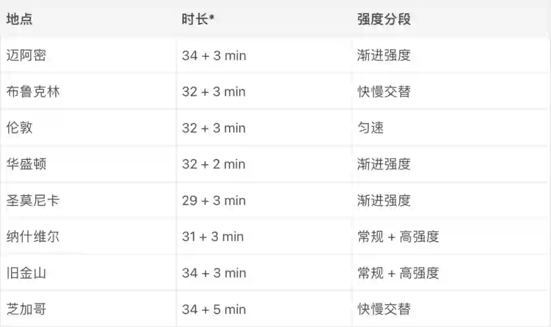 最近深圳的差天气屡成头条,户外跑步自然搁置。加上附近游泳馆也暂停开放早场,早上运动的刚需只能留在房间里实现。想到上个月 Apple Fitness+(苹果的健身课程订阅服务)新提供了一类「Time to Run」音频陪跑课程,而且根据宣传,这类课程也适用于室内,我便拿出阻力带,尝试用「Time to Run」来为自己的土法御寒增添几分 阳 洋气。「Time to Run」和此前的「Time to Walk」系列同属于「有声锻炼」(Audio Workouts)课程。每次课程长度都是略长于半小时,用户在 Apple Fitness+ 教练的指导下,沿着一条假想的城市路线完成跑步。配乐歌单由教练挑选,用苹果的话说,「旨在匹配每次跑步的强度、地点和训练内容,反映相关城市的精神。」截至本周,这个系列总共发布了八节课程,「选址」除了一节在伦敦,其他都在美国,大致覆盖率了其东西南北中各个区域。在接连三个阴沉的早上,我每次选择两条路线,加上之前在户外的短暂体验,算是基本通关了这些课程。对于这系列课程,我的主观评价介于良好和优秀之间,下面按照优缺点顺序分别说明理由。▍优点编排用心,张弛有度。对 Fitness+ 的现有评价普遍肯定其符合苹果出品水准的课程质量,Time to Run 也继承了这一优点,训练结构清晰且细节到位。每条路线开头,教练都会开门见山地介绍本次训练的时长和分阶段目标。尽管时间相近,训练的安排也不是千篇一律的;现有这几条就已经覆盖了全程匀速、全程 HIIT(高强度间歇)、半程匀速和半程 HIIT 组合等形式(见下表)。接着,教练便会切入一段两三分钟,节奏明快但又不过于激烈的配乐,用来引导用户逐渐提高步频、进入状态。 * 加号前后分别为实际跑步时间和结束后的休息配乐时间。 在每阶段开头和结尾,教练也都会及时通过引导词来提醒调整步伐、呼吸和姿态。对我这样的业余选手而言,跑到半途后,心态和形态懈怠是难免的,这样的保姆式提醒就显得及时且有用。引导词还会采用一些创意设计来呼应课程的城市主题。例如,伦敦和芝加哥路线中,教练就以这两座城市英文名首字母组词,分别作为相应路线各个分段的主题。一些细节也很到位。例如,考虑到兼顾户外跑的场景,当课程到中途时,教练还会提示锻炼已经过半,下一个路口就该掉头返回了。Time to Run 另一项值得称赞的设计、也是音频系列不同于其他 Fitness+ 课程的特征在于,训练的时间是开放的,显示的时长只是一个下限。在预定路线和歌单结束后,教练会提示后面还有一首歌的时间供你随意安排。如果没有尽兴,可以一直接着跑下去而不用停下来另外开始一次训练;而如果觉得训练量已经足够,也可以就此打住。配乐质量较高。这是意料之外的。习惯使然,我几乎从来不听音乐跑步,而都以播客作为背景音;为了安全和舒适,我一般戴 骨传导耳机 跑步,人声是这种耳机唯一能胜任的音频类型。此外,我听音乐的范围非常「死板」,曲库里绝大部分都是粤语、华语和日语(按比重降序排列)的慢速、小调流行乐;Fitness+ 作为一项主打欧美市场的健身服务,其配乐当然以快节奏,能「鼓舞人心」的英语歌曲为主,与我的听歌取向可谓南辕北辙。因此,在之前使用 Fitness+ 时,我都倾向于把音量调低,而根本不去关注背景音是什么。但跑步场景下的背景音似乎确有特殊加成效果。如上面所说,我这几天是用阻力带在室内原地跑。在没有室外环境作为参照物、也没有跑步机来辅助配速的情况下,仅靠个人意志和脑海估测,是不足以准确达到所需的心率和步频区间的。这时,和课程编排同步的选曲就显得非常实用了:只要跟着节拍迈步,基本就能达到预定的锻炼效果。 虽然听起来有些低级,但对于跑步这种体能消耗较大,没有额外脑力用作理性计算和思考的场景,服从身体对「动次打次」的本能响应,确实行之有效。此外,教练也没有仅仅把音乐作为工具,而是像一个合格的 DJ 那样,在切入每首歌之前认真介绍其年代、主题、创作等背景信息,与主题城市的关联,以及对这首歌的个人感受;这为训练过程增添了一些人情味。▍缺点城市主题的形式大于实质。尽管这是 Time to Run 的主打功能,但在我看来意义相对有限。Time to Run 并不是第一个试图将跑步「场景化」的课程。早在 2012 年,iOS 平台就有一款颇有人气的类型跑步应用 Zombies, Run!,帮助用户在假想的「僵尸大逃亡」场景中跑步。早年流行的跑步记录应用 Runtastic(已被阿迪达斯收编)也曾推出过称为「故事陪跑」(Story Running)的功能。然而,似乎并无依据能表明这种「虚拟场景跑」对于锻炼状态或效果的促进作用;一些研究还发现「游戏化锻炼」对于心率和自我评估的愉悦、体能等造成的差异甚小。在我的实际体验中,试图通过语音描述来达到身临其境的效果还是有些牵强了。 对于那些有实地感受的地标,例如纽约的布鲁克林桥、DC 的国家广场、旧金山的 Castro 区,我大抵还能在脑海中回忆出实地景象,甚至具体地势坡度带来的不同「脚感」。而对于没有去过的伦敦、迈阿密等地,教练再眉飞色舞的叙述也只能是左耳进右耳出。至于在 Apple Watch 表盘上不时展示「实地照片」、提示用户抬腕观看的设计,似乎刻意设计的痕迹过重,在气喘吁吁的跑步过程中很难说算调剂还是打扰。实际上,哪怕苹果进一步精编脚本,让 Time to Run 在脑海中的「建模精度」进一步提高,我的评价可能仍然如是。对我而言,跑步