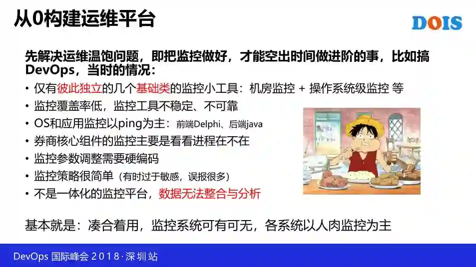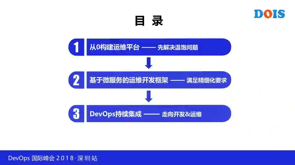 第一个阶段是我们花了 6 个多月的时间构建了集中运维平台。接着呢,运维平台出来了,大家就会提出一些精细化的需求,因此我们构建了一个开发框架,并基于此做了一些小系统。目前我们处于第三阶段,我们搭建了 DevOps 持续集成和持续交付的系统,走向了开发运维。整个分享过程中,我会跟大家讲一些心得体会,也会讲到一些技术细节。希望既有干货,也能分享到经验和方法。
