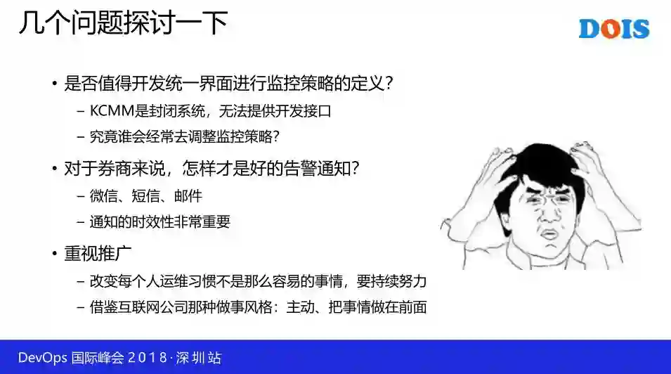 最后一点很重要:重视推广。DevOps 平台也好,监控平台也好,任何一个新系统对传统使用习惯的改变,多少都会受到内部的一些抵触,这时候我们应该花点时间做内部运营。比如我们会经常走到不同团队 leader 身边,坐下来问他们:这个平台用得怎么样,哪些功能模块用得不舒服,是否需要修改,要改哪里?按照这种方法,最后完成的系统一般大家是满意的。
