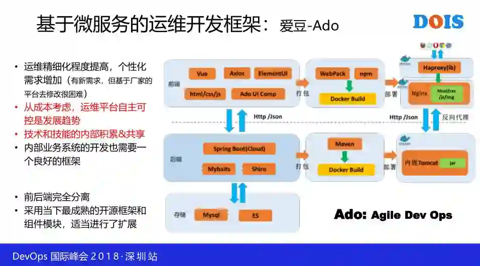 这个框架给大家简单介绍一下:它是一个Web开发框架,我们给它起了一个名字叫做Ado。它采用前后端完全分离的设计。前端用Vue,后端使用了SpringCloud的一些组件。前后端分别运行在不同的容器中,通过 Docker 或者 docker Swarm发布。