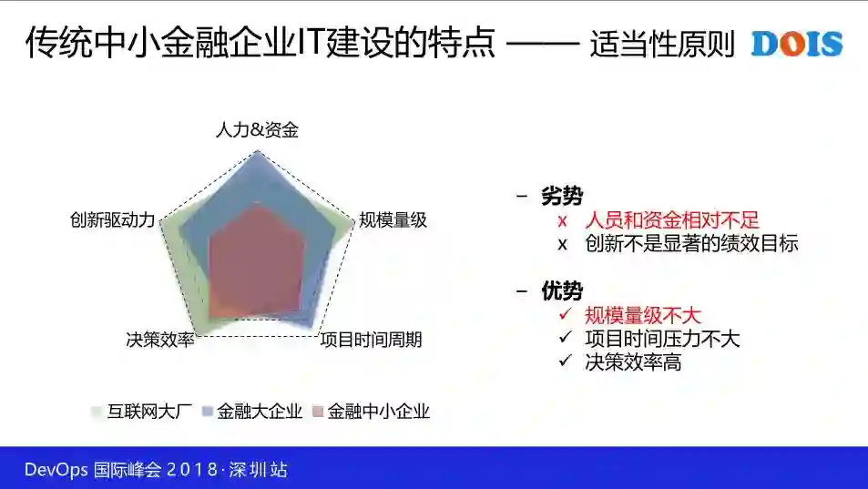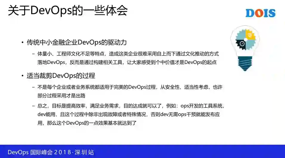 传统中小金融企业 DevOps 的驱动力因为其体量小、工程师文化不足(或者是工程师资源不够),这时候如果采取自上而下通过文化建设的方式是行不通的,你想推动 DevOps,但其他人不配合或者没时间配合,反倒是你构建了一些工具能够帮助大家提高开发、测试和上线的效率,从这个点出发可能才是 DevOps 的驱动点。