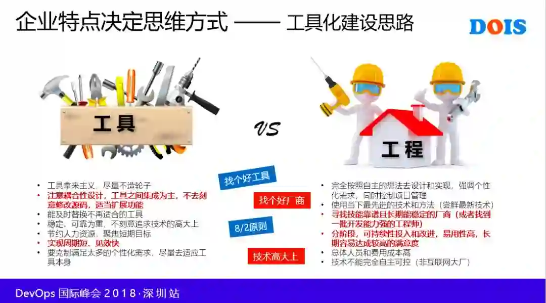 上面就是传统中小金融企业 IT 建设的特点。我们要认清自身的优势,然后基于现状去做 IT 建设。有了这个前提,接着就是“企业特点决定思维方式”。这就要求中小金融企业采用“工具化的建设思路”。那么,工具化和工程化的区别是什么?