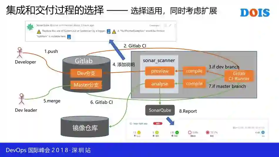 下面这张图是我们现在的CI过程:先把代码提交到 Git 的 Dev 分支,触发CI-Runner,它会从Git服务器上拉取代码进行编译,然后使用 SonarQube 进行代码的局部扫描,即对你本次提交的代码进行扫描。扫描完成之后会把结果反写到 Gitlab 上,告诉你代码存在哪些问题。