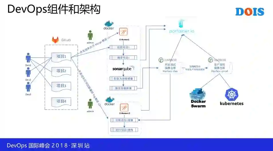 下面讲讲这个 DevOps 系统的组件和架构。代码管理是用 Gitlab,CI/CD过程使用CI-Runner,它可以跑在容器里,也可以是虚拟机和物理机,根据需要构建,比如大量的代码进行编译,选择IO比较好的运行时环境,如果跑测试,选择内存和CPU比较好的环境。