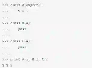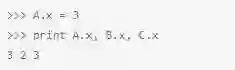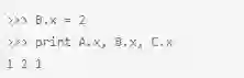 在Python中,类变量都是作为字典进行内部处理的,并且遵循方法解析顺序(MRO)。在上面这段代码中,因为属性x没有在类C中发现,它会查找它的基类(在上面例子中只有A,尽管Python支持多继承)。换句话说,就是C自己没有x属性,独立于A,因此,引用 C.x其实就是引用A.x。