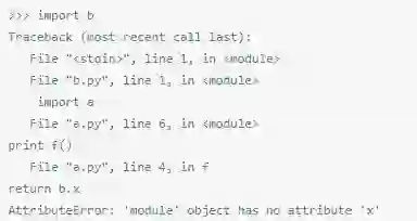 出错了,这里的问题是,在导入b.py的过程中还要试图导入a.py,这样就要调用f(),并且试图访问b.x。但是b.x并未被定义。