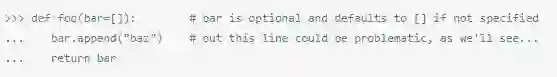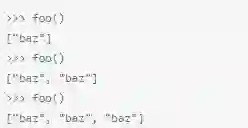 在上面这段代码里,一旦重复调用foo()函数(没有指定一个bar参数),那么将一直返回'bar',因为没有指定参数,那么foo()每次被调用的时候,都会赋予[]。下面来看看,这样做的结果: