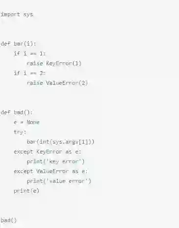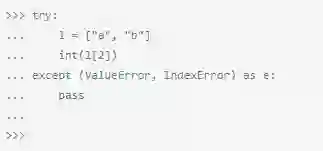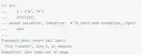 问题在这里,except语句并不需要这种方式来指定异常列表。然而,在Python 2.x中,except Exception,e通常是用来绑定异常里的 第二参数,好让其进行更进一步的检查。因此,在上面这段代码里,IndexError异常并没有被except语句捕获,异常最后被绑定 到了一个名叫IndexError的参数上。