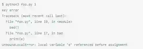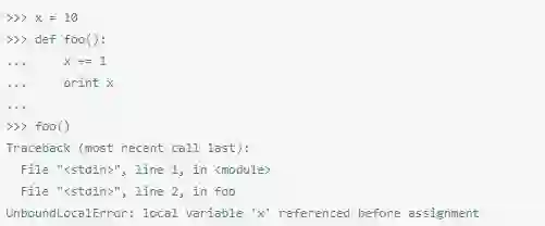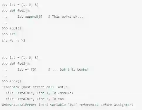 许多人会感动惊讶,当他们在工作的函数体里添加一个参数语句,会在先前工作的代码里报UnboundLocalError错误( 点击这里查看更详细描述)。