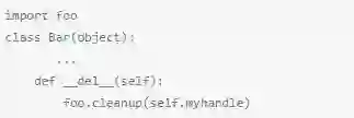 当解释器关闭时,该模块的全局变量全部设置为None。因此,在上面这个例子里,当__del__被调用时,foo已经全部被设置为None。