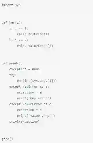 在一个异常语句里捕获多个异常的正确方法是指定第一个参数作为一个元组,该元组包含所有被捕获的异常。与此同时,使用as关键字来保证最大的可移植性,Python 2和Python 3都支持该语法。