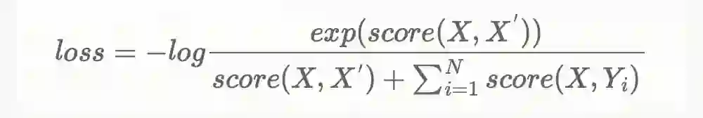 loss = -log \frac{exp(score(X,X^{'}))}{score(X,X^{'})+\sum_{i=1}^{N}score(X,Y_i)}