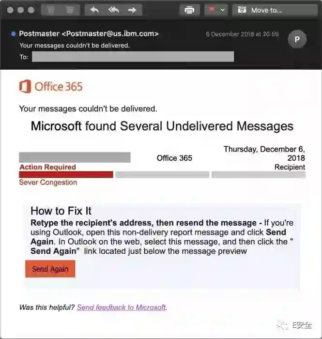 ISC Handler Xavier Mertens发现的该新活动宣称“微软发现多个未送达消息”,并提示用户点击“再次发送”链接以尝试再次发送邮件。下方为该钓鱼邮件示例。