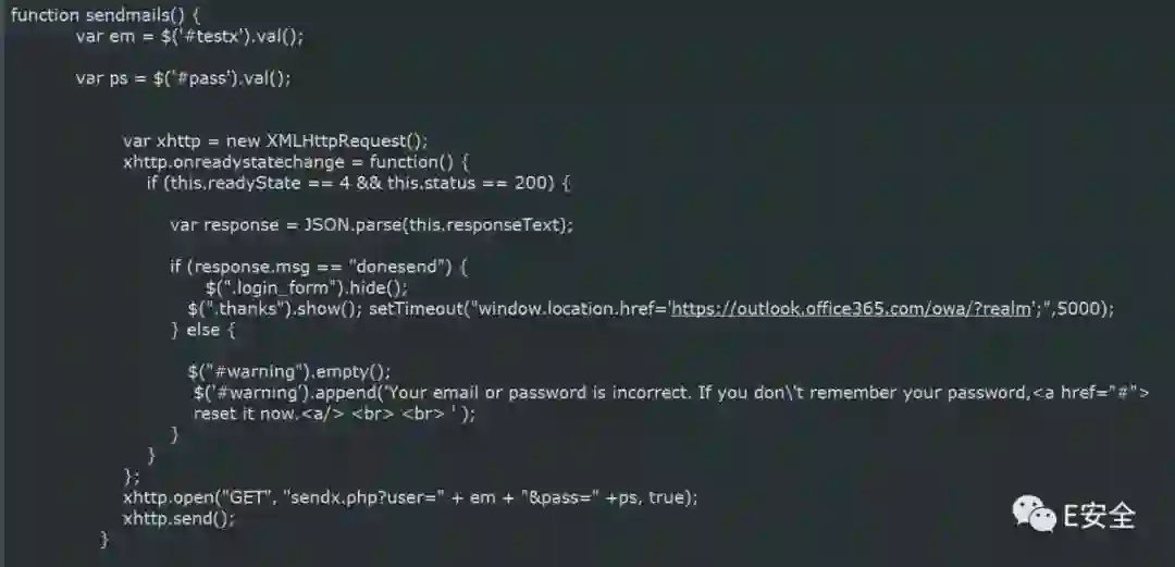 用户输入密码后,名为sendmails的JavaScript功能将向sendx.php函数发送电子邮件地址以及用户所输入的密码,这会将用户重定向至合法网址https://outlook.office365.com/owa/?real Office 365 login URL。